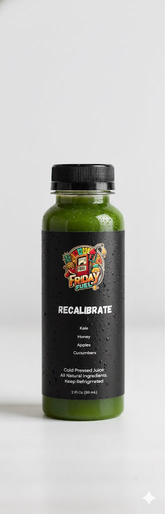 • Green: RECALIBRATE: Your mental reset. A nutrient-dense powerhouse of Kale, Apple, Cucumber. This is "brain food" meant to detoxify the system, stabilize your pH, and provide the steady, natural focus needed to dominate your to-do list.